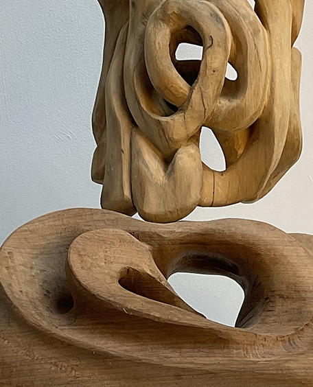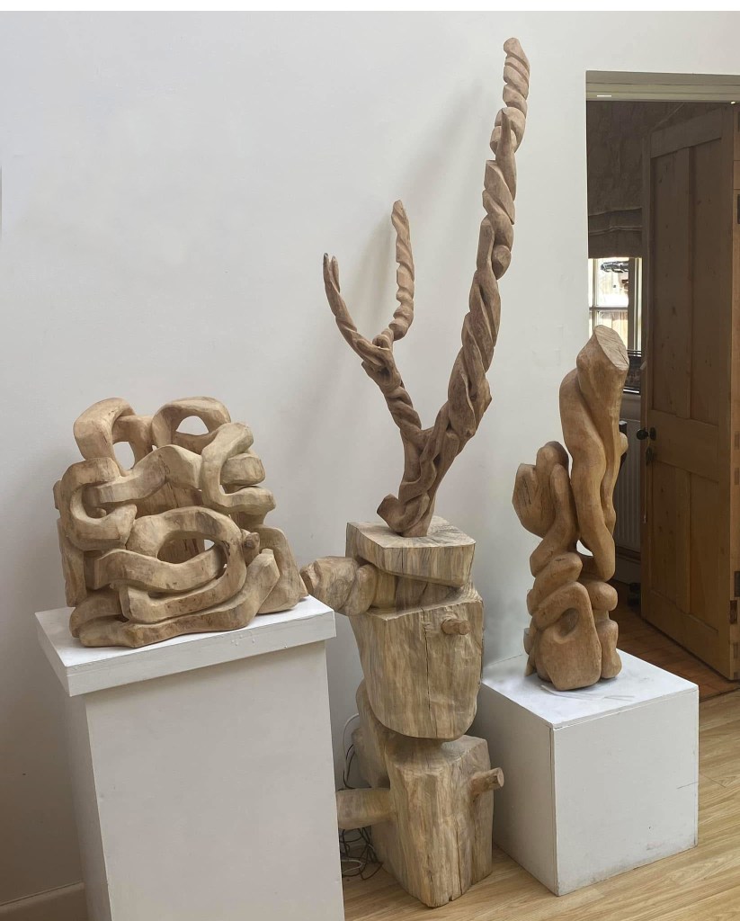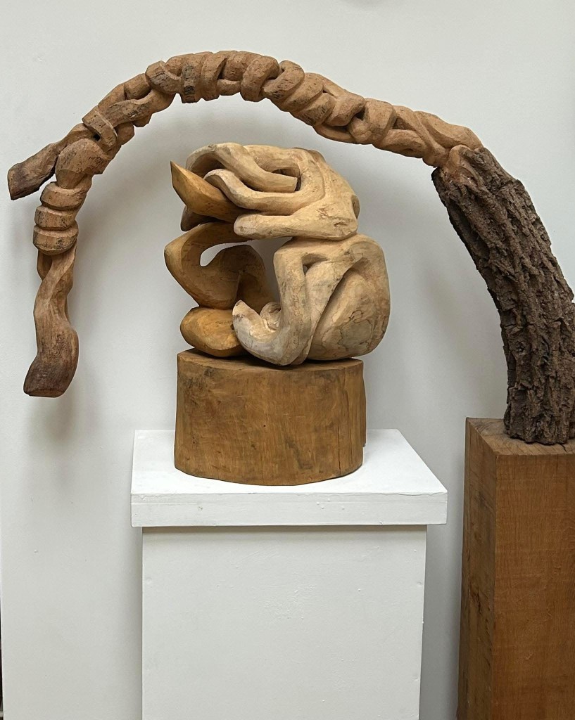 Sculpture Sculpture ‘Ivy Curve’ 2017 with ‘Crouched Willow’ 2025 The Mycelial Cord, Hand carved willow. 2024 ‘How Dreams Connect’ Upcycled wood. 2023 Form Within, in situ hand carved Scots Pine. 2020 Horizontal carving. Boxwood 2023 Related
